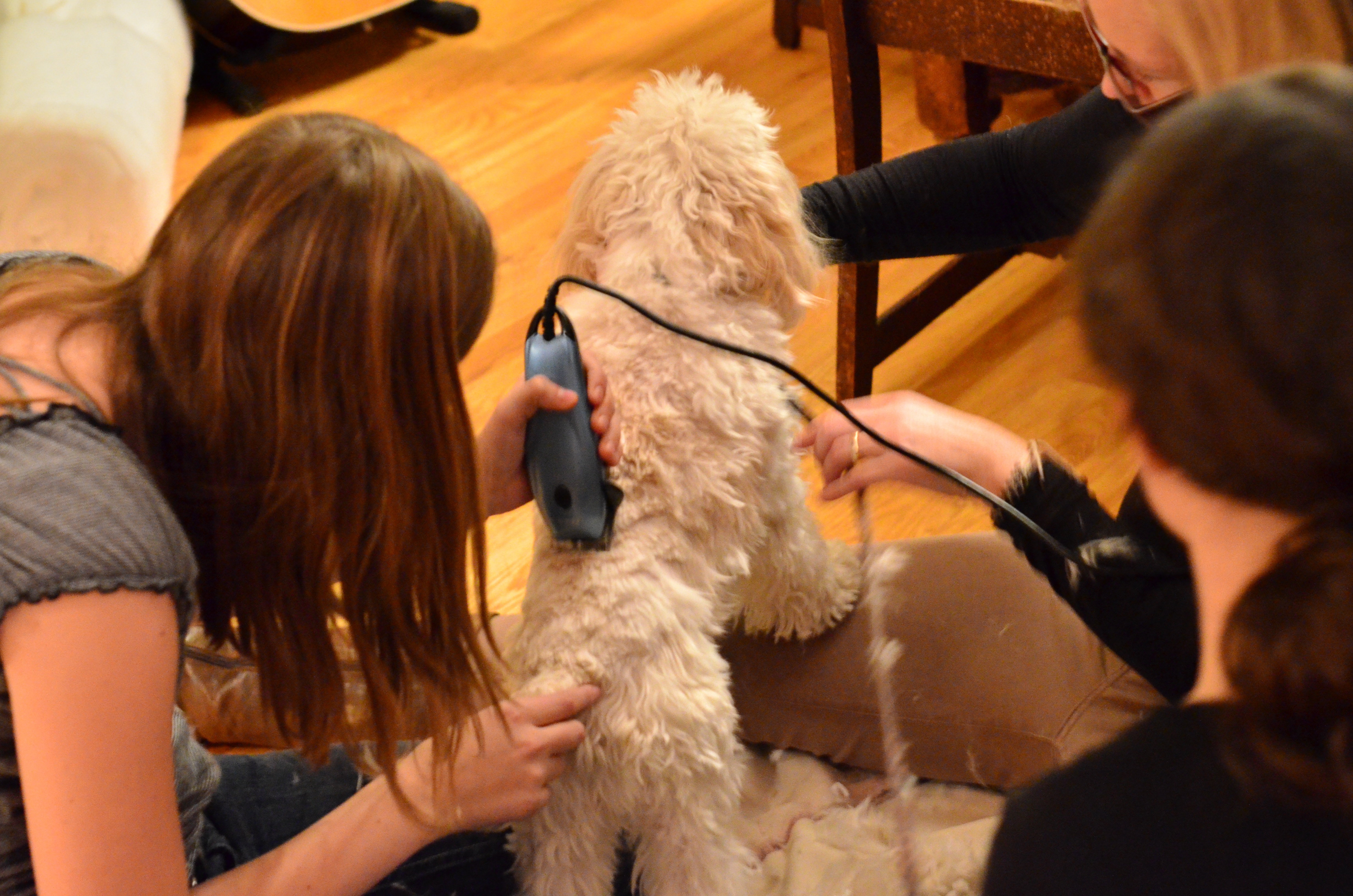 The girls and I decided that grooming a dog is much harder then it looks. The girls said he needs to wear a sweater for awhile, especially if we take him for a walk. They are a little embarrassed over the bald spot I shaved into the side of his back. Umm…it took me awhile to get use to the trimmers.