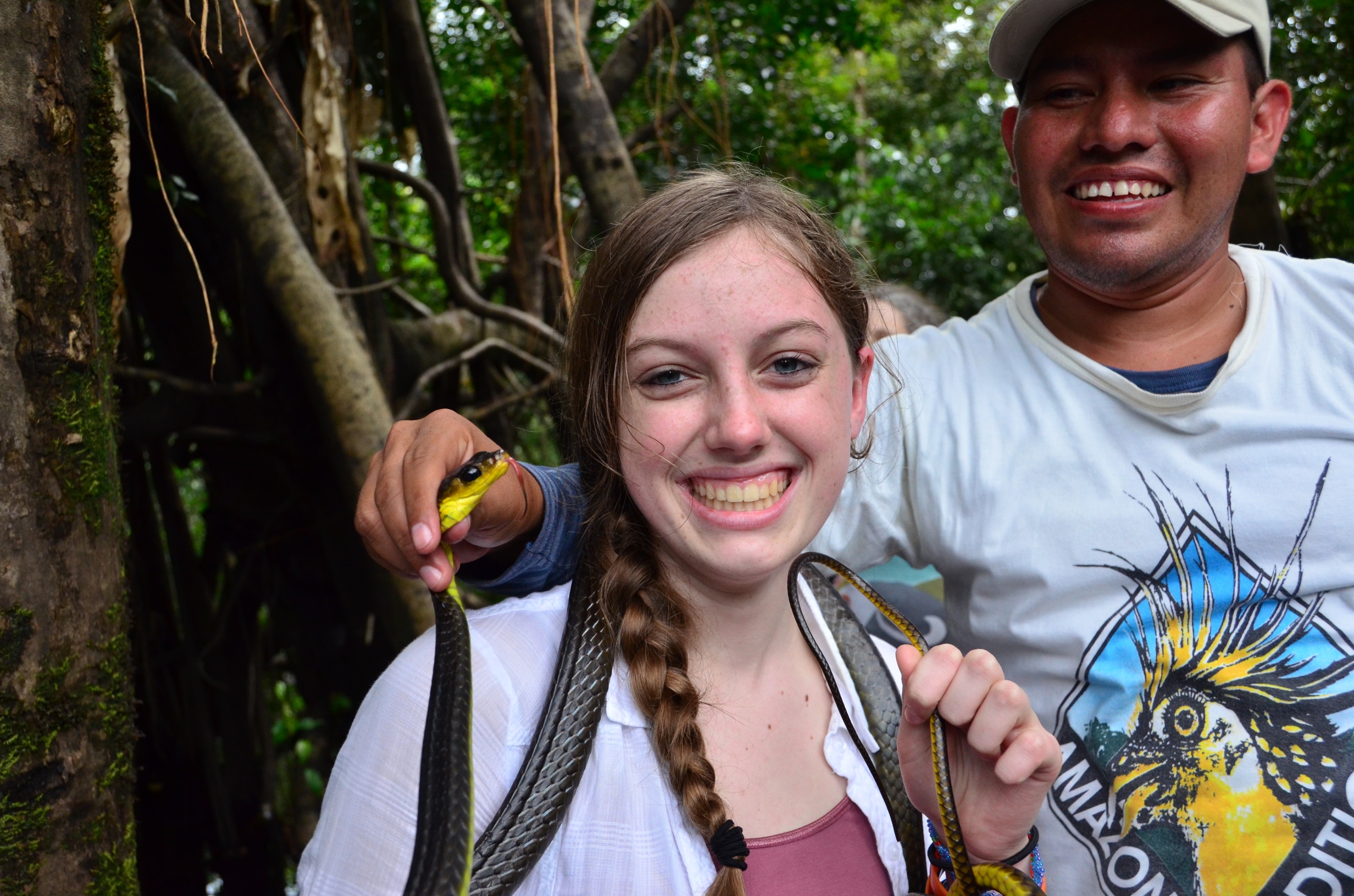 We were traveling to the Amazon Research Center lodge, and our guides were using machetes to forge a path for the boat through the flooded jungle, when all of sudden, next to me on a branch was a six-foot long snake of some sort. I began to loose it. Our guide then stopped the boat. He reached out to grab the snake so he could show us the snake, and the snake began to flail. As it flailed, our guide worked hard not to let it bite him.