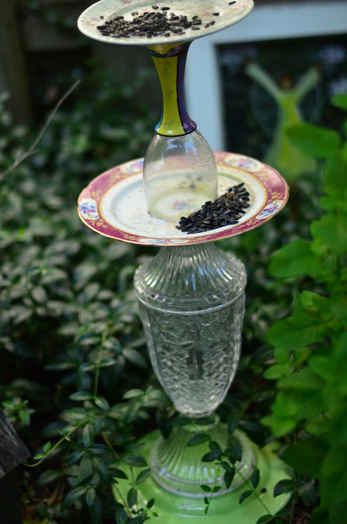 A few weeks ago, I got in a crafty mood. It’s a rare event for me to get all crafty, but Pinterest had inspired me. The next thing I knew, I was taking old dishes and glass to make bird feeders and yard art. My yard art didn’t turn out like the pictures on Pinterest, but that didn’t matter, because I was proud of my projects.